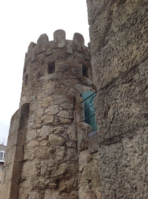 Retomamos la escalera de metal y bien agarrados progresamos hacia arriba por un tramo que sube por la fachada trasera, y se mete en este primer piso, para continuar su ascensión por dentro del citado cuerpo y bajo el rosetón que da también a esa fachada trasera. Es fácil sentir vértigo a pesar de la seguridad de la escalera. Incluso hay cuerdas para agarrarse bien. Antes de subir, desde el primer piso que hemos descrito se accede, por un pasadizo, a una de las torrecillas defensivas, que funcionan como husillo con su escalera de caracol.