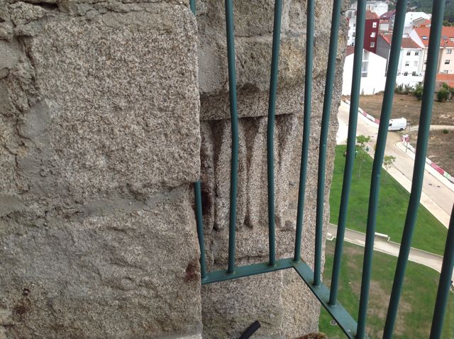 Desde aquí toda esta estructura vertical se nos presenta todavía más contundente, si cabe. A la izquierda observamos una torrecilla que quiere recordarnos estos elementos defensivos medievales que vemos, sin ir más lejos, en los portales norte y sur de la catedral ourensana. Continuamos la subida, desde aaquí, por escaleras metálicas.